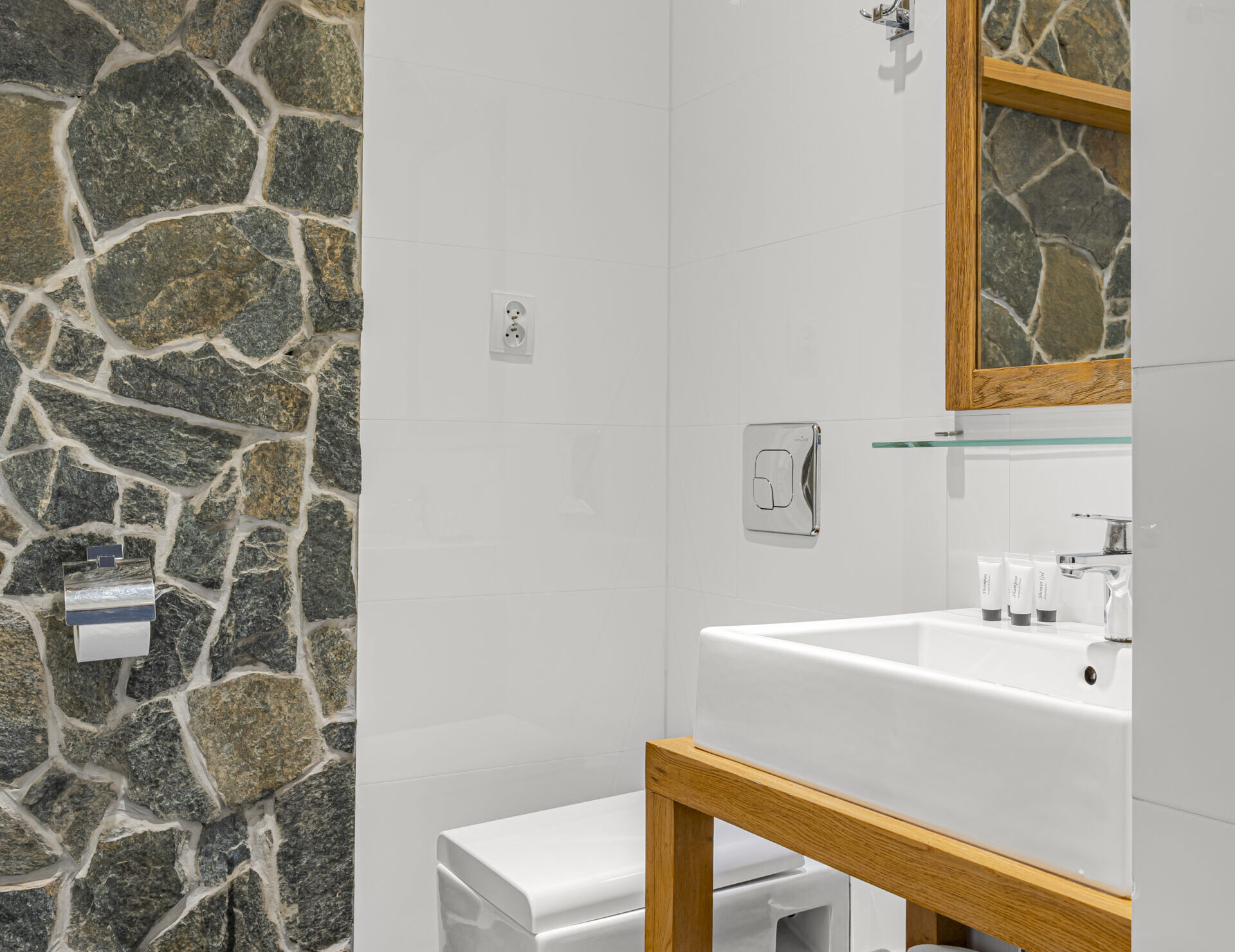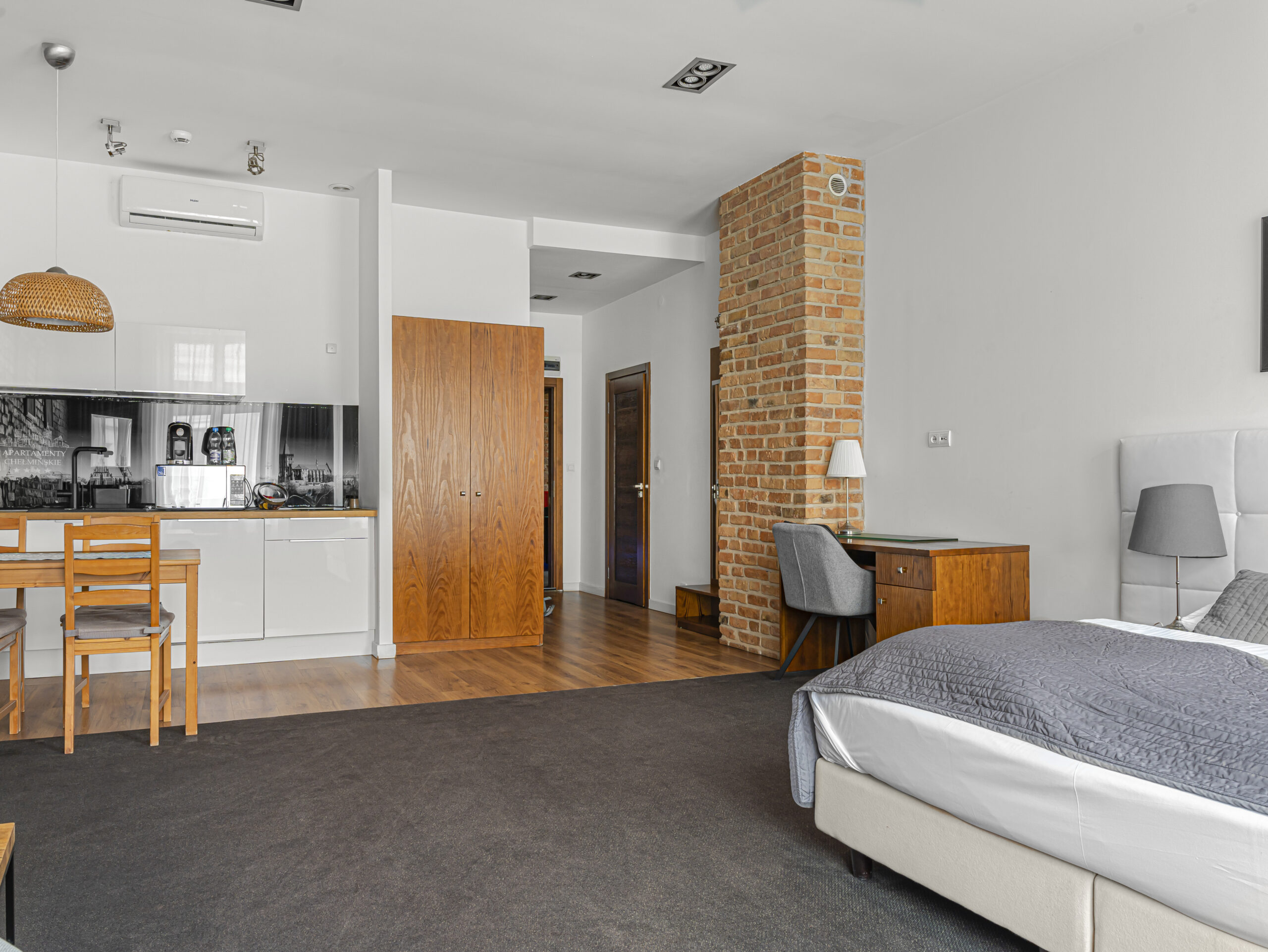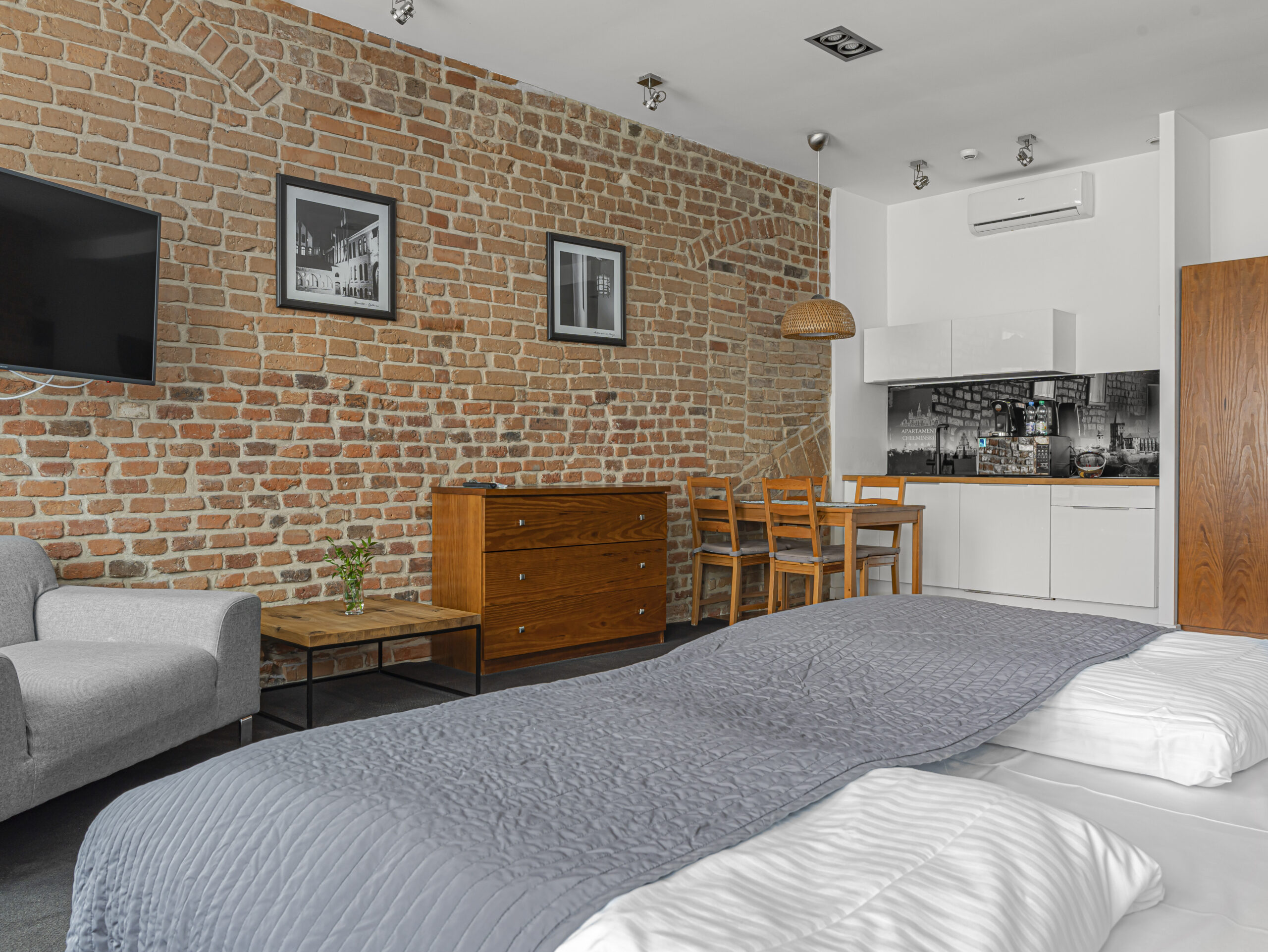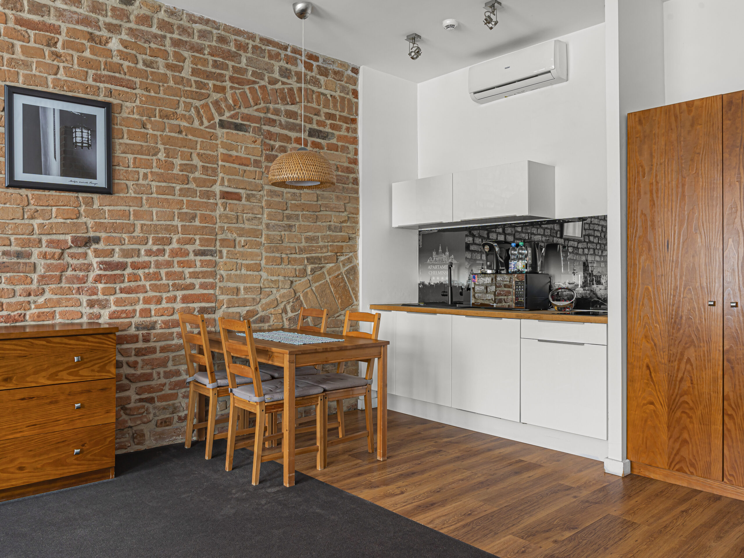W apartamencie znajduje się salon z podwójnym łóżkiem małżeńskim, aneksem kuchennym wyposażonym w stół dla czterech osób, duży, wygodny fotel oraz przestrzeń do relaksu i odpoczynku. Kuchnia z pełnym wyposażeniem umożliwia przygotowanie posiłków w komfortowych warunkach. Łazienka z prysznicem jest elegancko wykończona i funkcjonalna. Do dyspozycji Gości pozostają także dodatkowe udogodnienia, takie jak telewizor, szybkie Wi-Fi, pojemne szafy na ubrania oraz stylowe detale podkreślające charakter wnętrza.