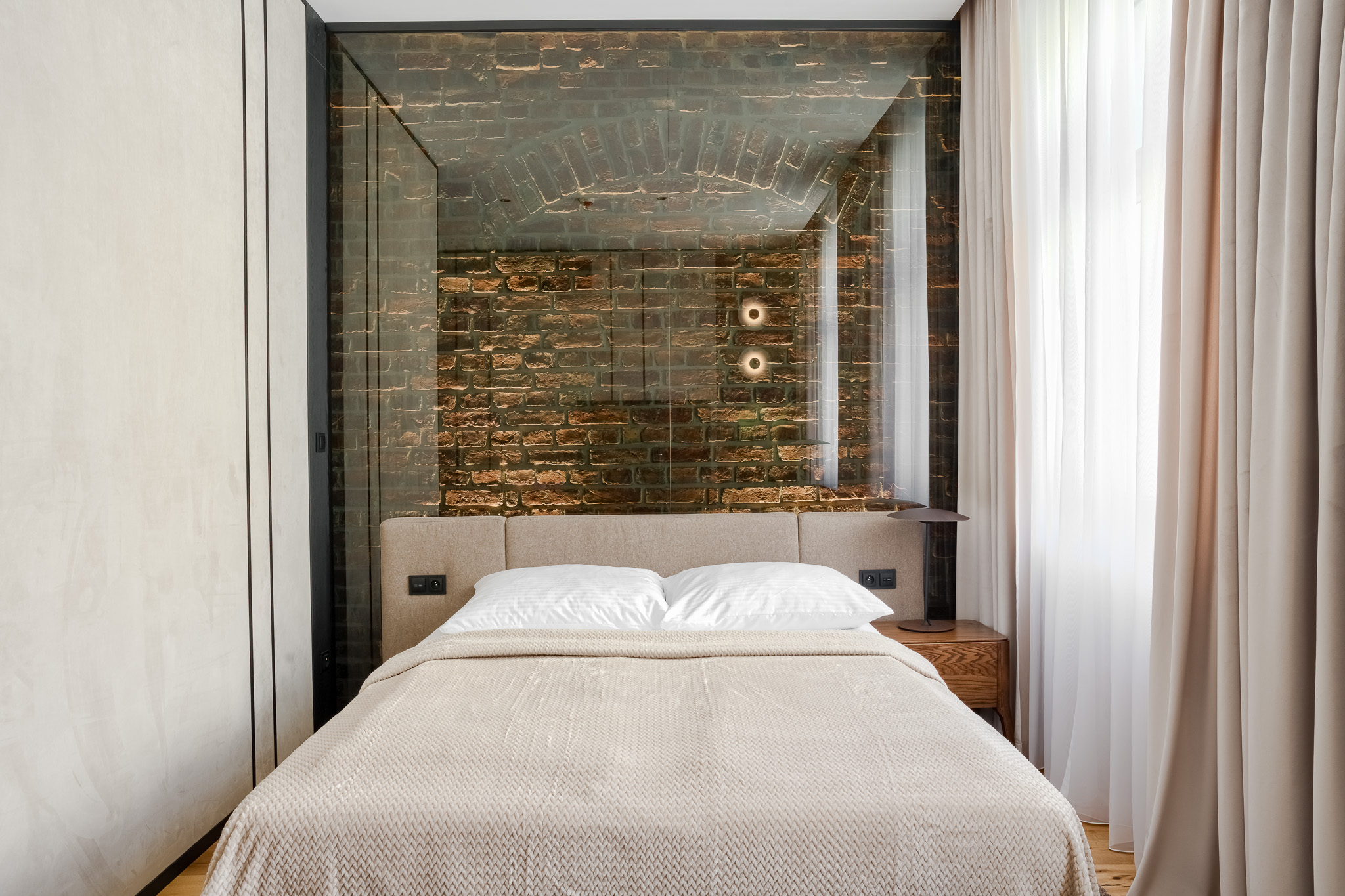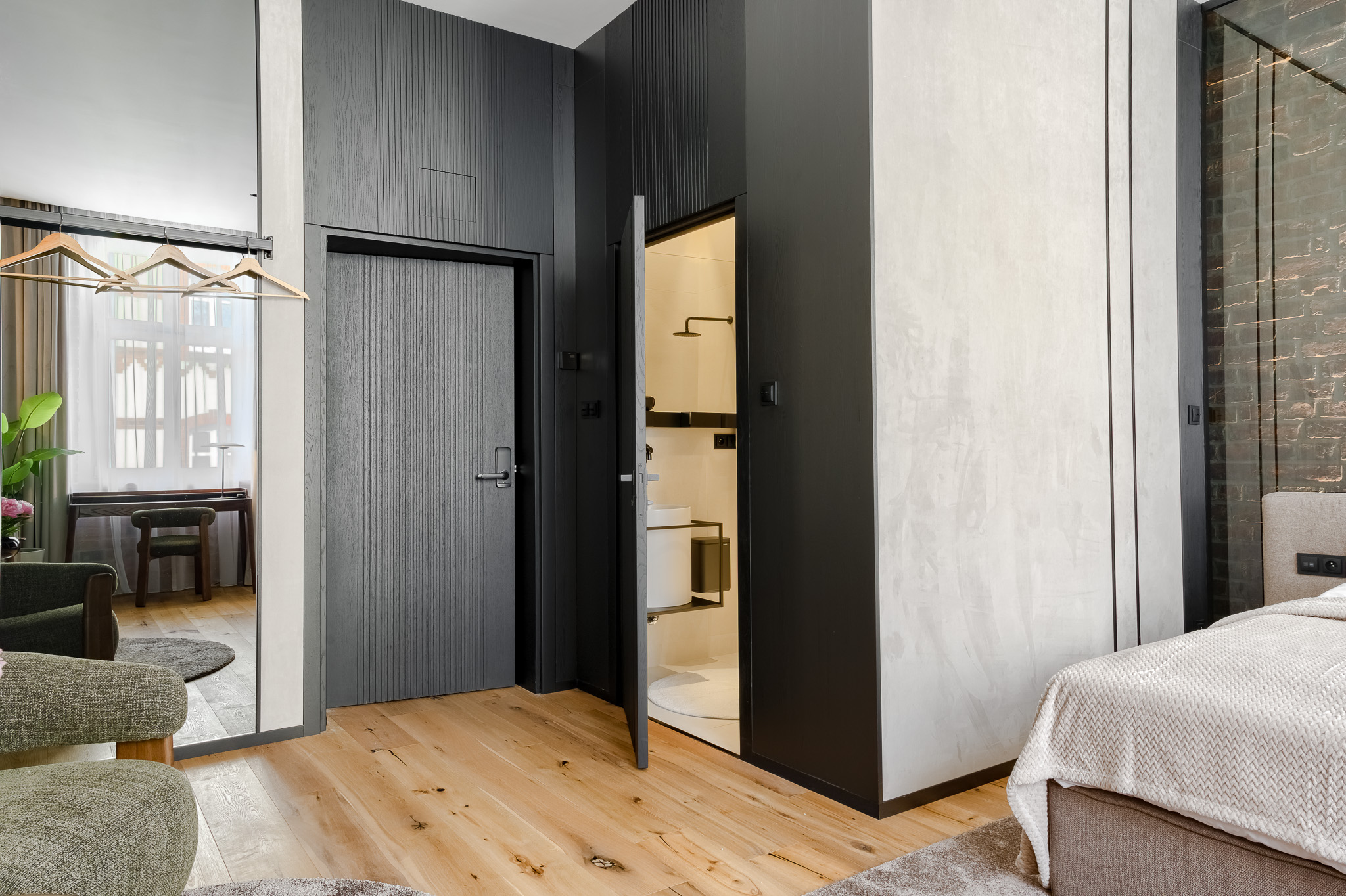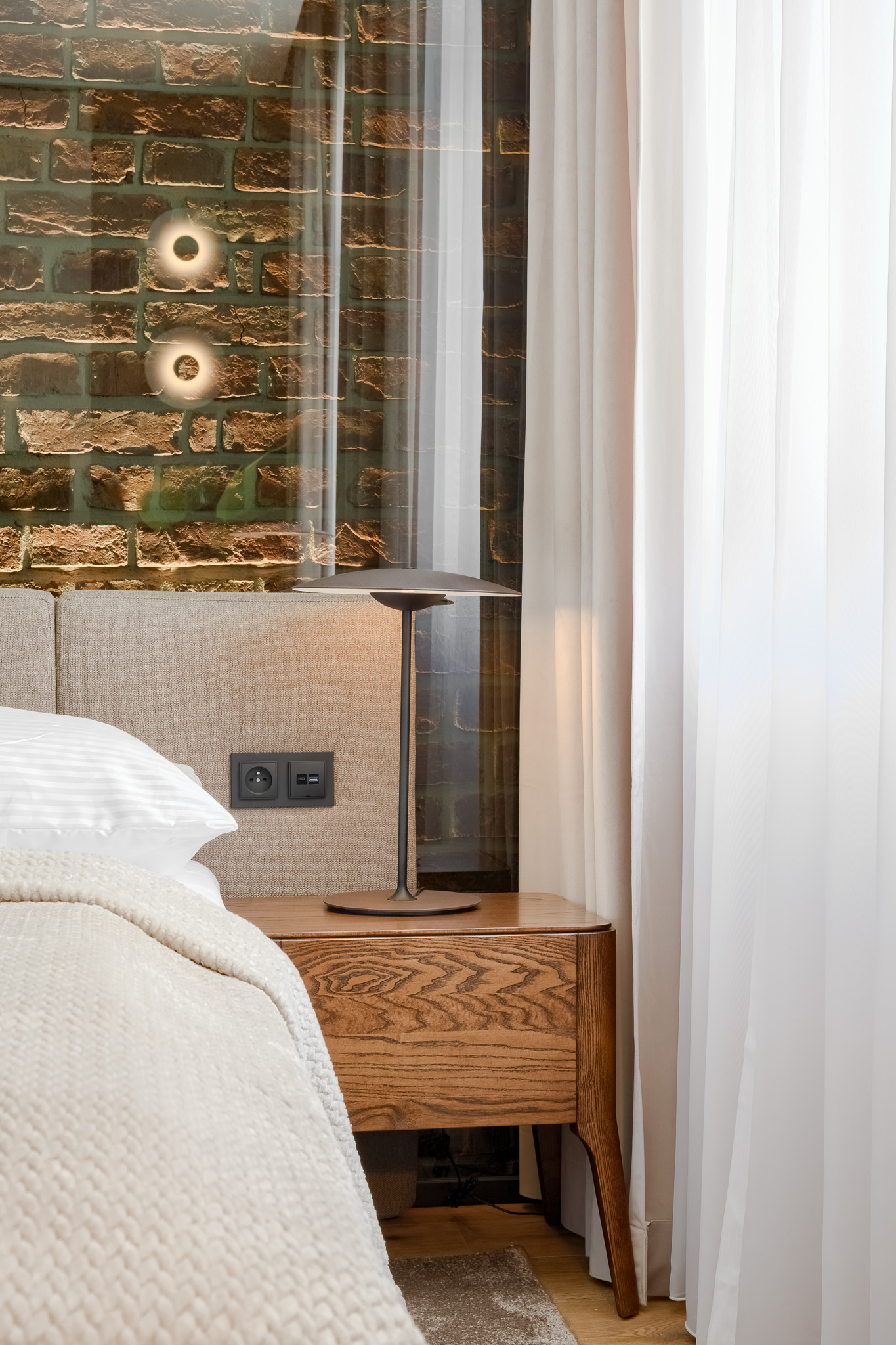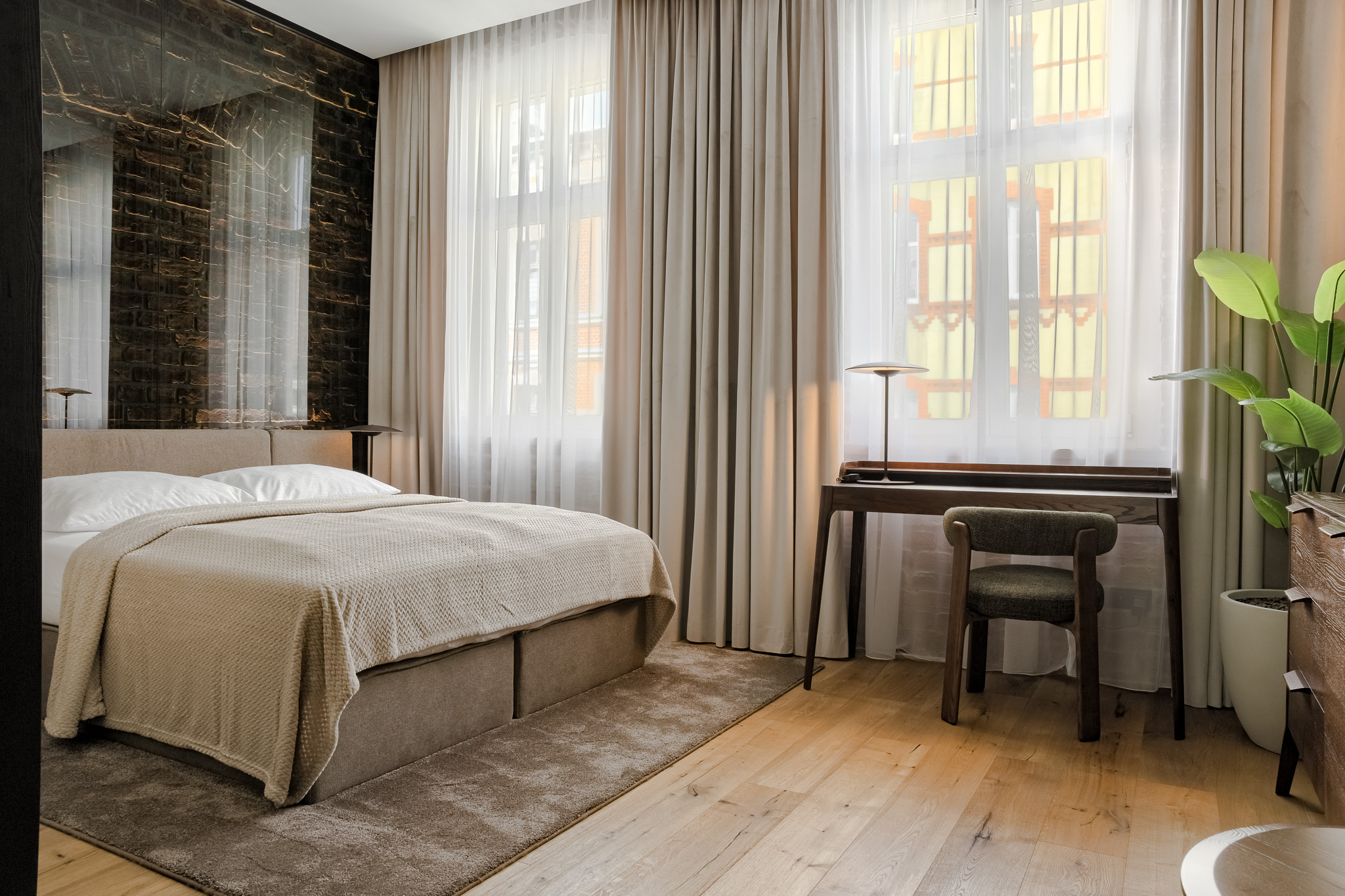 Ciepłe drewno, ceglane akcenty i subtelne oświetlenie nadają wnętrzu przytulny, butikowy charakter. Starannie zaprojektowana strefa wypoczynkowa oraz wygodne biurko z naturalnego drewna zapewniają idealne warunki do pracy i odpoczynku po intensywnym dniu.